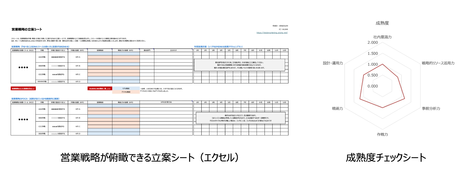BtoB企業向けに営業戦略を体系的に立案する手順書です。ALUHA独自の戦略立案シートでKGIからKPI、計画、PDCAまでを具体化し戦略を俯瞰できます。営業戦略の成熟度チェックシートもあります。